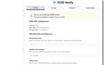 主な機能には、UID2およびEUID SDKのアクティビティを追跡するリアルタイムSDKモニタリングが含まれており、APIコールやサーバーレスポンスを含みます。さらに、アイデンティティイベントの完全なタイムラインを表示するイベント履歴機能、クッキーやlocalStorageを調査するためのストレージインスペクタ、および詳細なコンテキストでSDKエラーをキャッチする堅牢なエラー検出機能を提供します。UID Verifyは、Prebid.jsおよびGoogle Secure Signalsともシームレスに統合されており、これらのプラットフォームで作業するユーザーの機能を強化します。